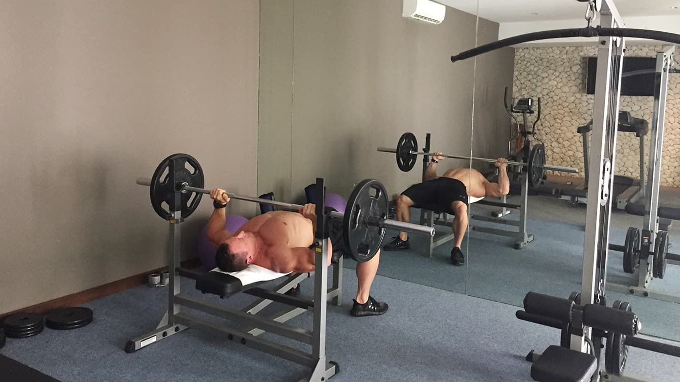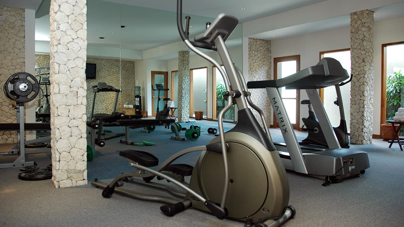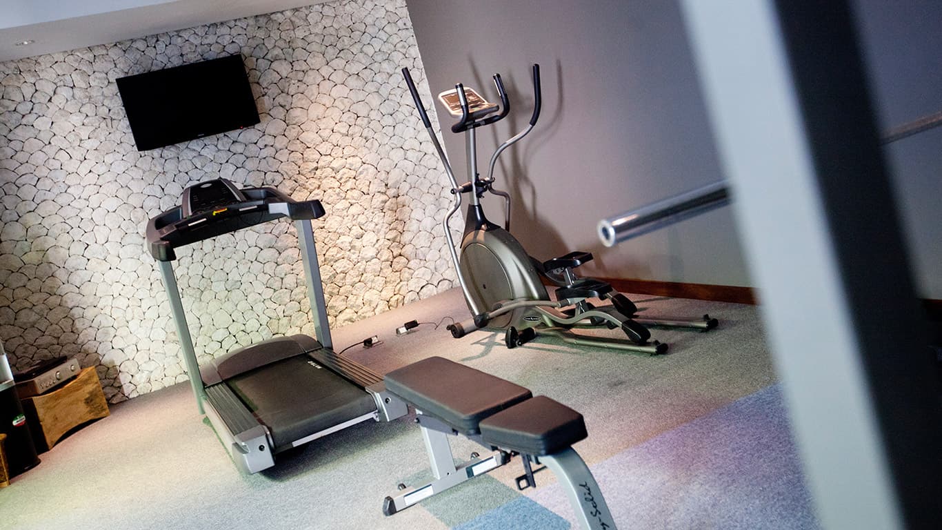 modern, professional cardio-training machines such as treadmill, bicycle and a elliptical trainer and several free weights, dumbbells, bench press and a pro lat station are installed for your personal workout.